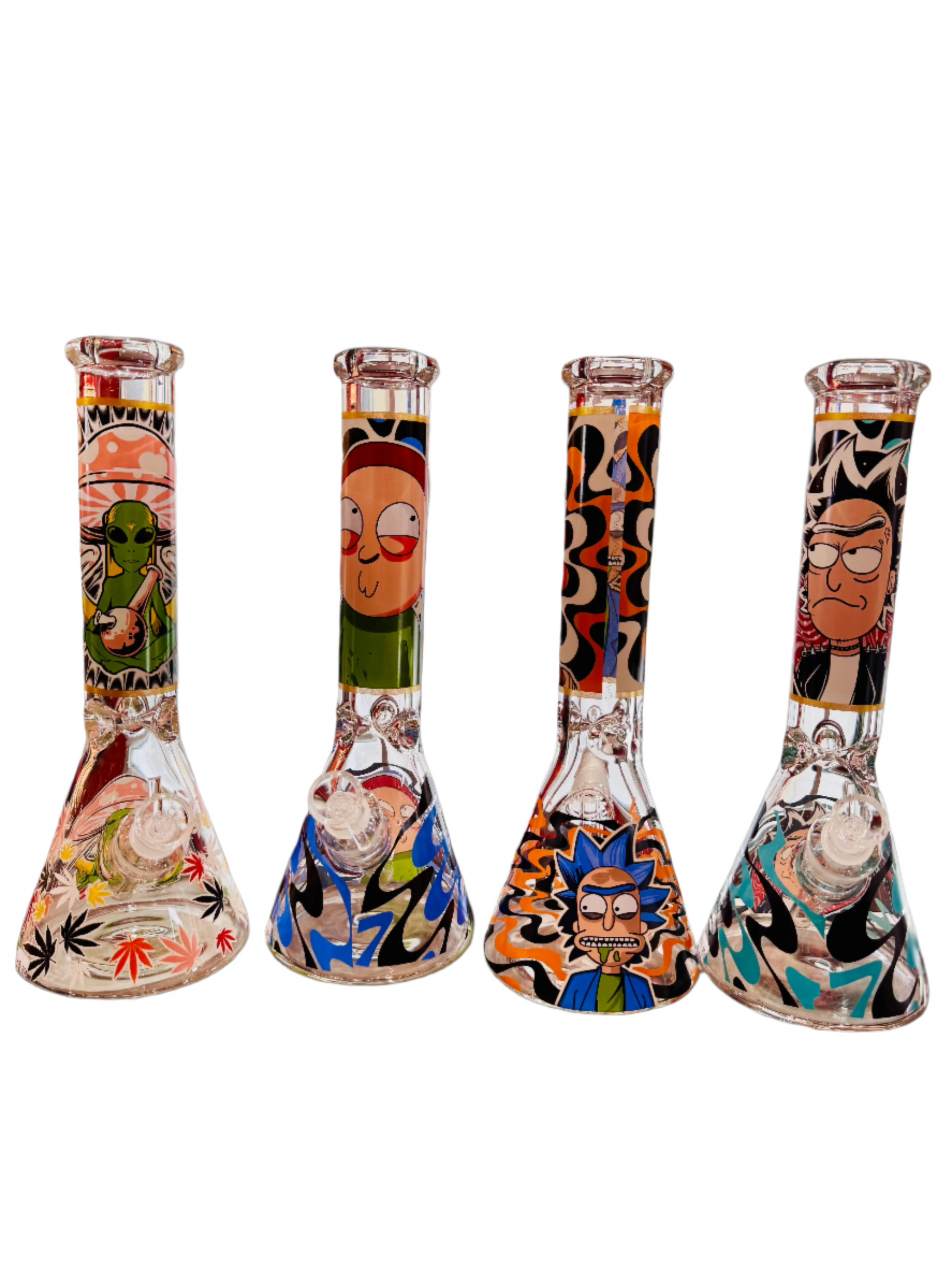 This 14" tall, 7mm thick glass bong is the perfect combination of durability and style. Featuring vibrant Rick & Morty decals that glow in the dark, it's a standout piece for any collection. The built-in ice catcher ensures smooth, chilled hits every time, making it as functional as it is fun.