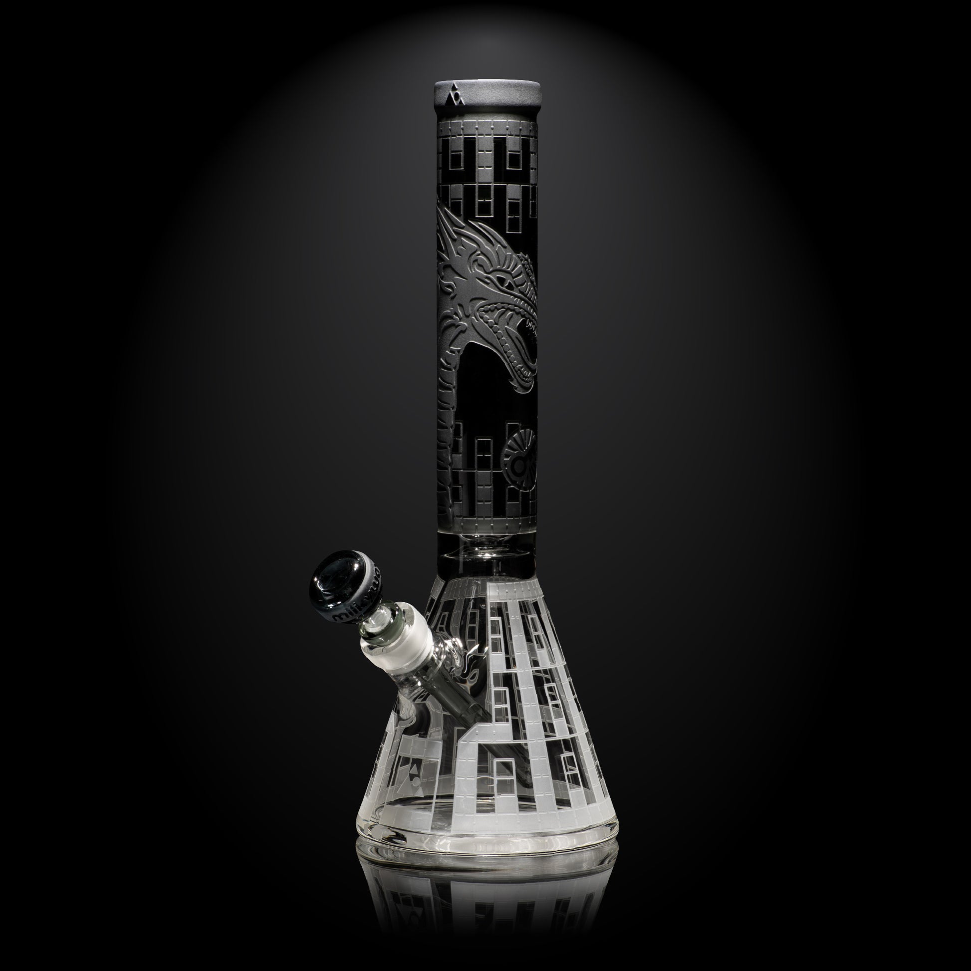 The Chronicles of Kush: Darthor’s Lair – This 15” beaker depicts the legend of Darthor the Dragon’s escape from the impenetrable cage deep in the depths of Estalan. We’ve upgraded this version to contain a ice-restriction and 15mm thick base. It’s now made with a smoke tube instead of the original black.